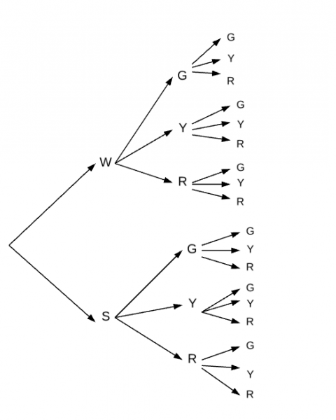 Let's say you are going on a drive to visit your friend. There are two routes: the windy route (W) or the straight route (S). On both routes, you would encounter two stop lights that can turn green (G), yellow (Y), or red (R). You want to know the sample space for what possible outcomes there are on this drive. It might seem very hard to visualize how many options there are, but with a tree diagram, it becomes much more clear.