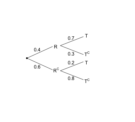 Thus, \(P(R | T) = { P(R and T) \over P(T) } = { 0.28 \over 0.4 } \) = 0.7