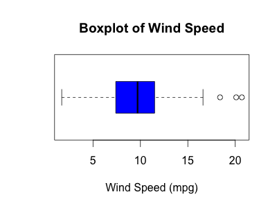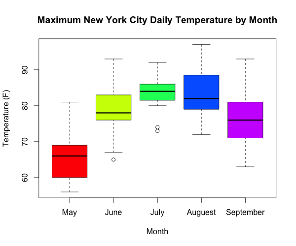 Next, let's analyze the relationship between maximum daily temperature and month. To do this, we will construct a side-by-side boxplots using the R code shown below: