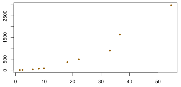 y = c(2.01, 6.05, 33.12, 66.69, 81.45, 365.04, 492.75, 897.85, 1635.98, 2980.96)